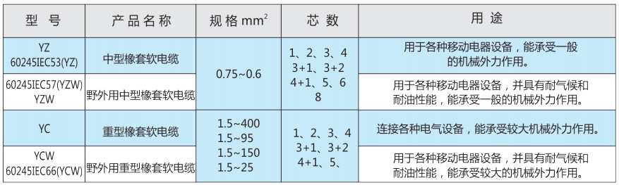 通用橡(xiang)套軟電(dian)(dian)纜適用于交流(liu)額(e)定(ding)電(dian)(dian)壓(ya)450/750V及(ji)(ji)以下動力、家用電(dian)(dian)器及(ji)(ji)各種(zhong)移動式(shi)野外(wai)電(dian)(dian)氣設(she)備和工具的(de)電(dian)(dian)力傳輸,其機械性能均符合GB/T5013-2008《額(e)定(ding)電(dian)(dian)壓(ya)450/750V及(ji)(ji)以下橡(xiang)皮絕(jue)緣(yuan)電(dian)(dian)纜》及(ji)(ji)JB/T8735-2016《額(e)定(ding)電(dian)(dian)壓(ya)450/750V及(ji)(ji)以下橡(xiang)皮絕(jue)緣(yuan)軟線(xian)和軟電(dian)(dian)纜》標準。