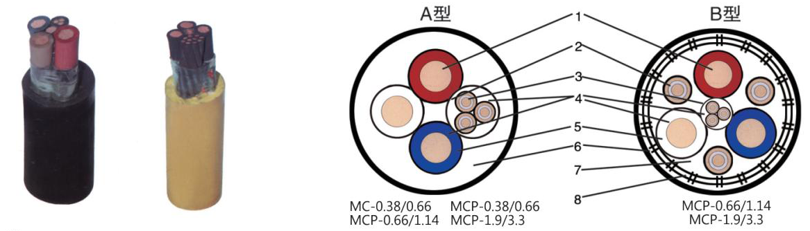 1、動力(li)線芯(xin)導體 2、地線芯(xin)導體及半(ban)導電(dian)層(MC型電(dian)纜可(ke)擠包絕(jue)緣層)3、控制線芯(xin)導體4、絕(jue)緣 5、動力(li)線芯(xin)半(ban)導電(dian)屏蔽層(MC型電(dian)纜無屏蔽層)6、外護套7、內護套8、加強層