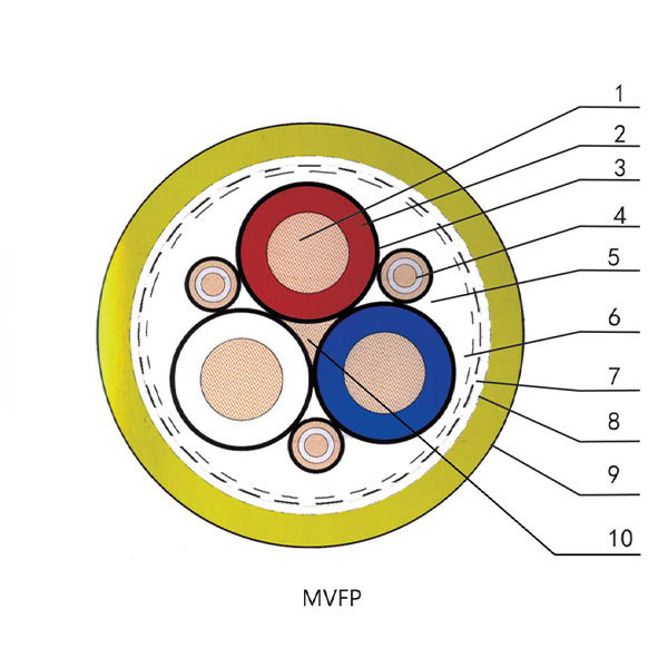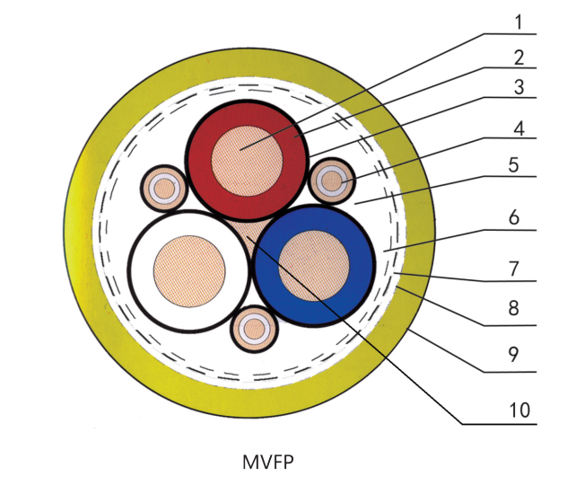 1、動力線芯(xin)(xin)導(dao)體 2、動力線芯(xin)(xin)絕緣(yuan) 3、絕緣(yuan)屏(ping)蔽 4、地線芯(xin)(xin)導(dao)體 5、半導(dao)電層6、內護套或(huo)絕緣(yuan)帶(dai)繞包(bao)層,7、鍍錫銅(tong)絲編(bian)織屏(ping)蔽層8、金屬/塑料復(fu)合帶(dai)繞包(bao)層