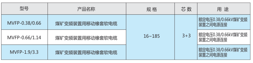 該(gai)電(dian)纜適用于額定電(dian)壓1.9/3.3kV及以下煤礦(kuang)變頻裝置(zhi)之間的電(dian)源連接,其機械物理(li)性能(neng)及電(dian)性能(neng)均符(fu)合(he)Q/QL010、NB/T11128-2023《煤礦(kuang)變頻裝用橡(xiang)套軟電(dian)纜》