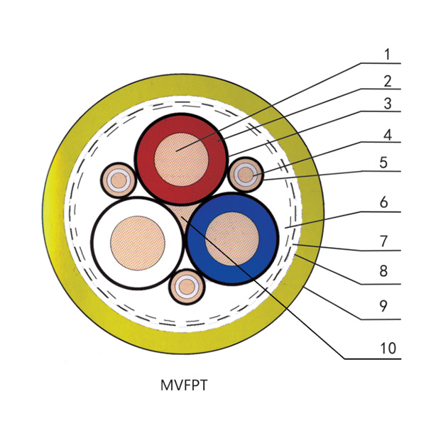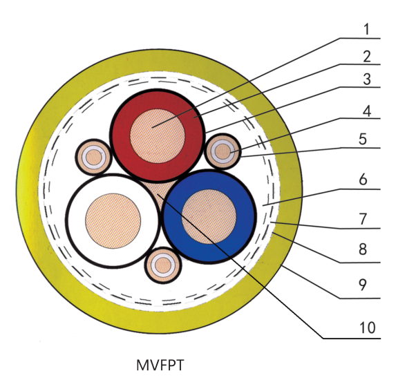 1、動(dong)力線芯導體 2、動(dong)力線芯絕(jue)緣(yuan) 3、絕(jue)緣(yuan)金屬/纖維(wei)編織屏蔽 4、地(di)線芯導體 5、半導電層 6、內護套(tao)或絕(jue)緣(yuan)帶(dai)繞包層 7、鍍錫(xi)銅(tong)絲(si)編織屏蔽層 8、金屬/塑料(liao)復合帶(dai)繞包層 9、外護套(tao) 10、填(tian)充