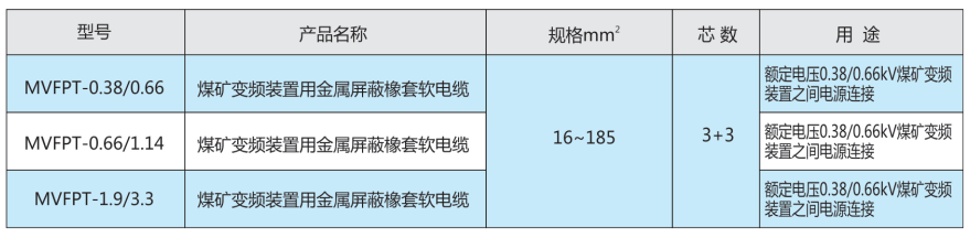 該(gai)電(dian)(dian)纜(lan)適用(yong)于額定(ding)電(dian)(dian)壓1.9/3.3kV及以(yi)下煤礦(kuang)(kuang)變(bian)頻裝置(zhi)之間(jian)的(de)電(dian)(dian)源(yuan)連接,其(qi)機械物理性能及電(dian)(dian)性能均符合NB/T11128-2023《煤礦(kuang)(kuang)變(bian)頻裝置(zhi)用(yong)金屬屏蔽橡套軟電(dian)(dian)纜(lan)》